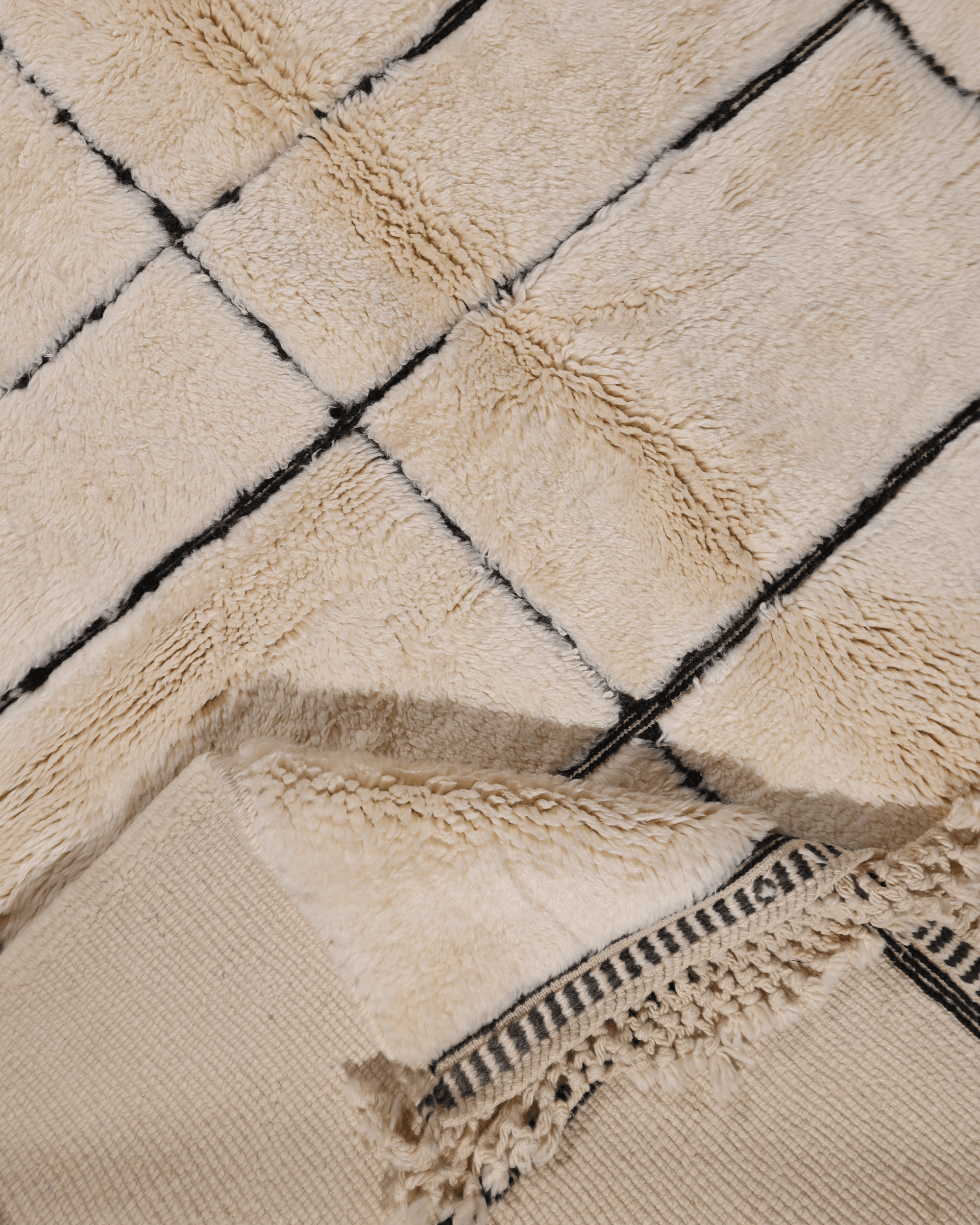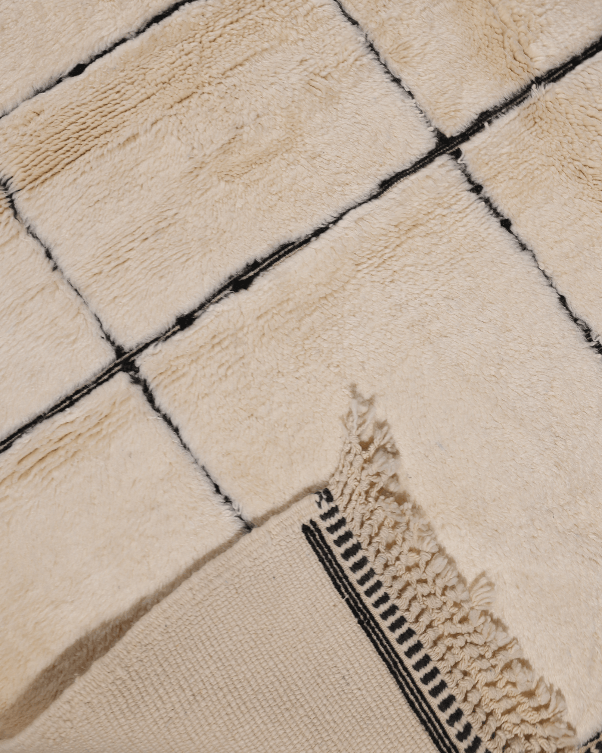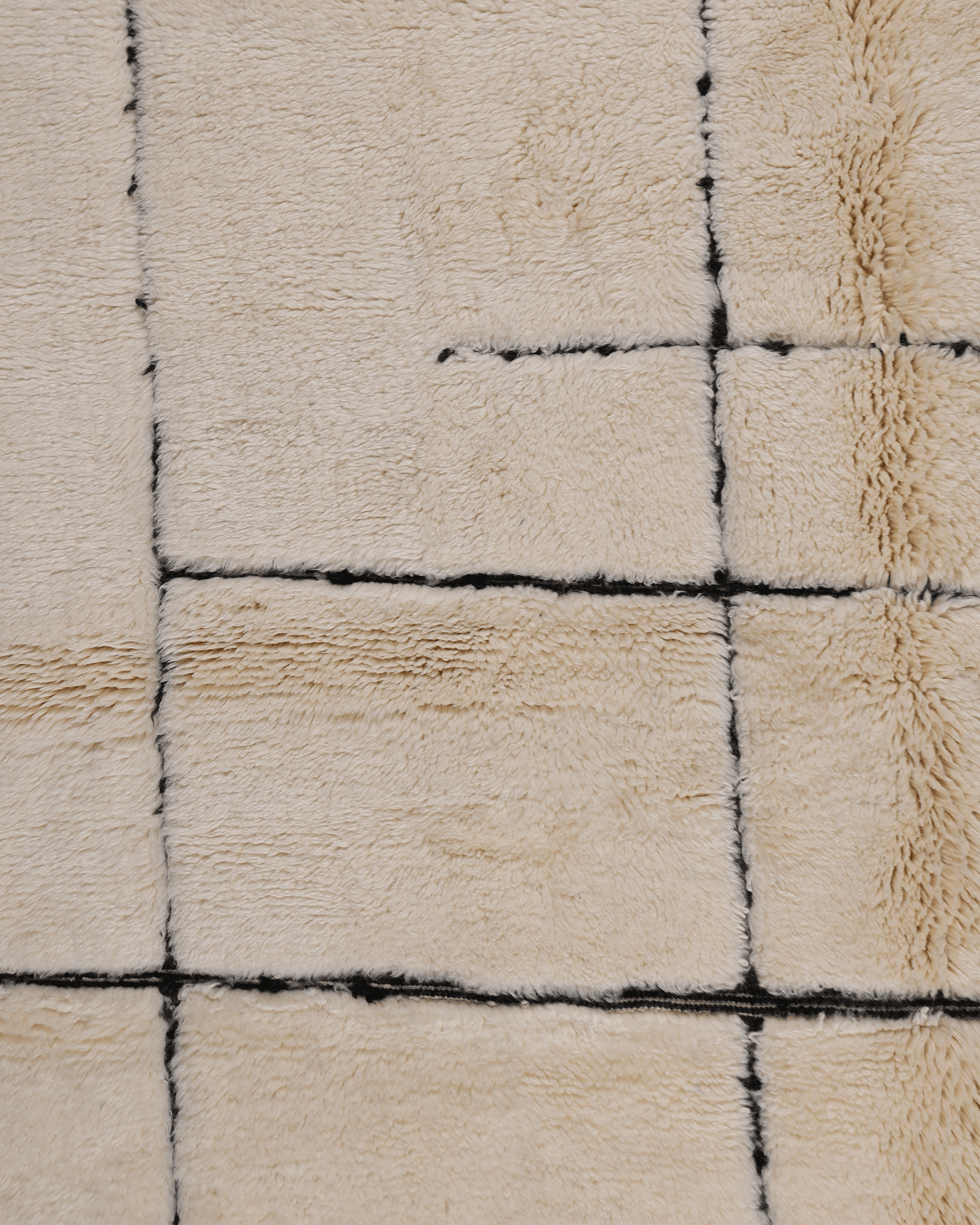 Crafted from 100% natural wool, this piece features a warm ivory field accented with hand-drawn black lines forming a bold yet balanced geometric composition. The thick, plush pile offers exceptional softness underfoot while maintaining a clean, architectural presence.