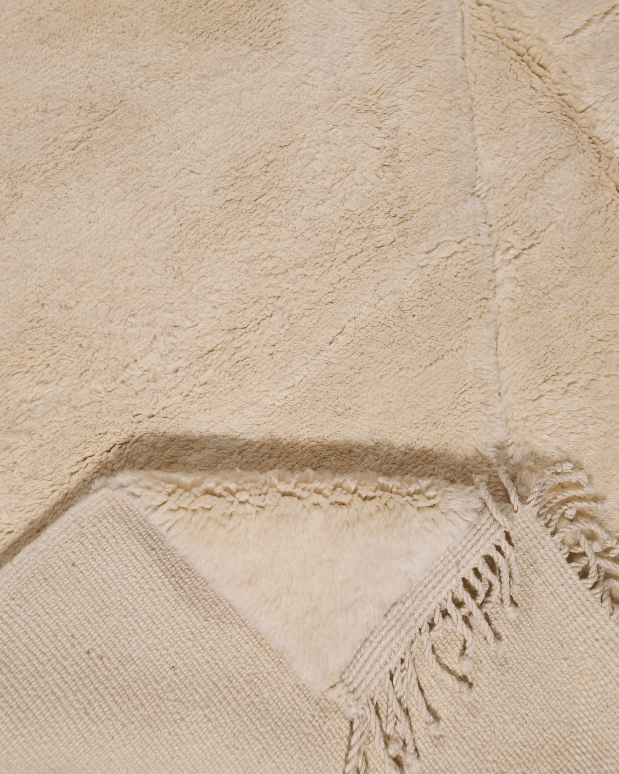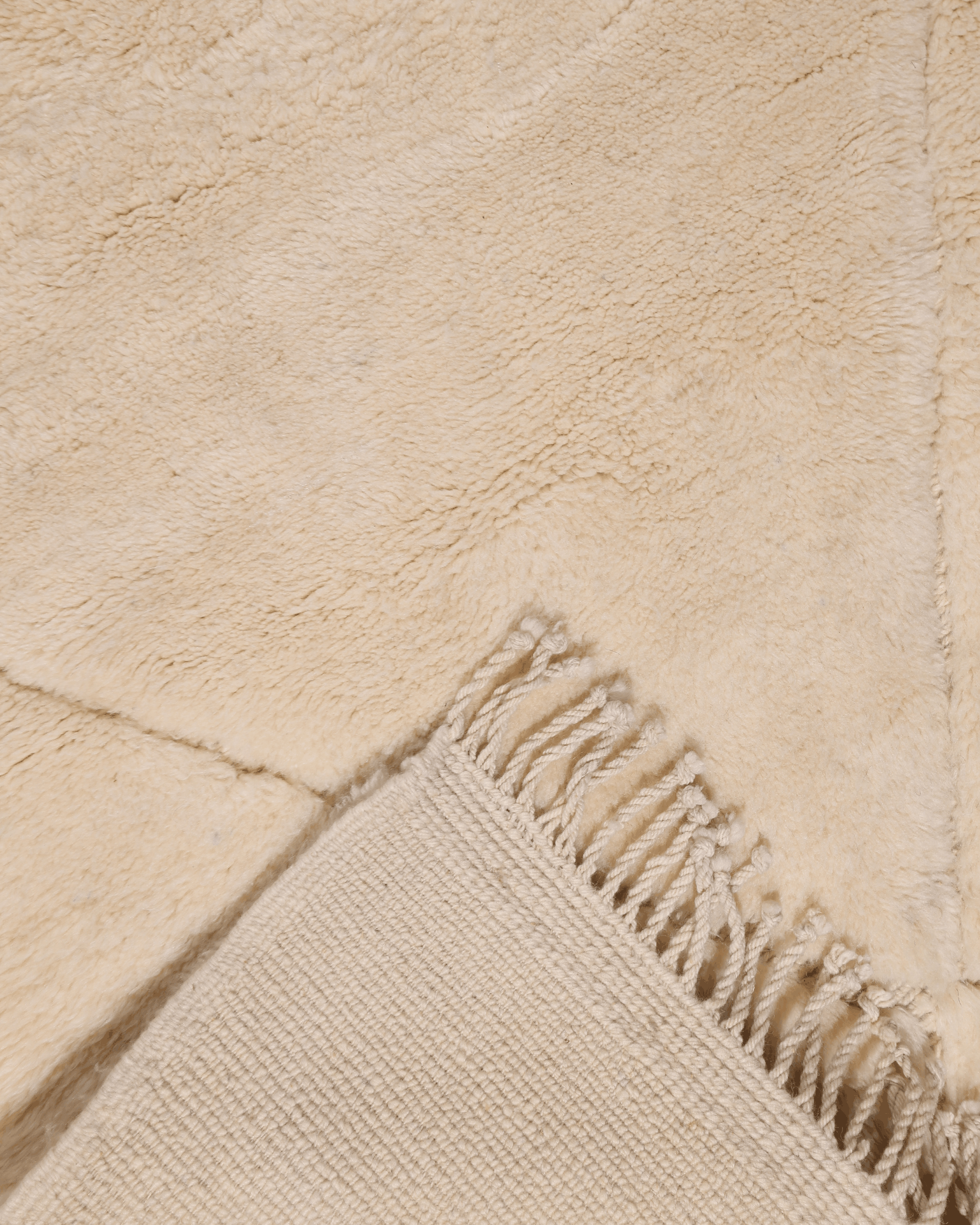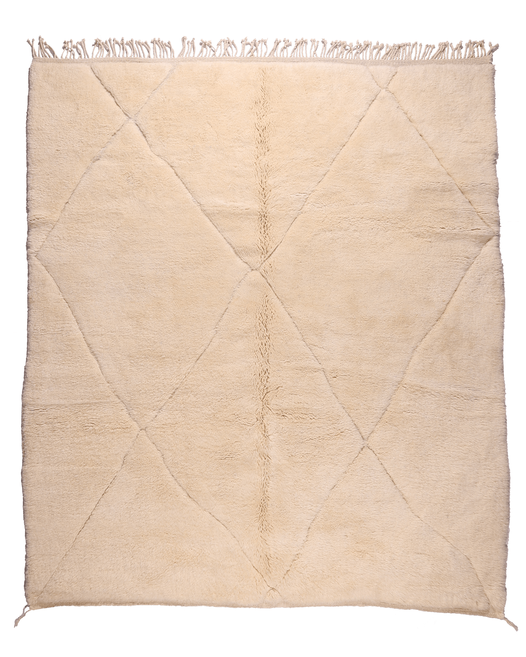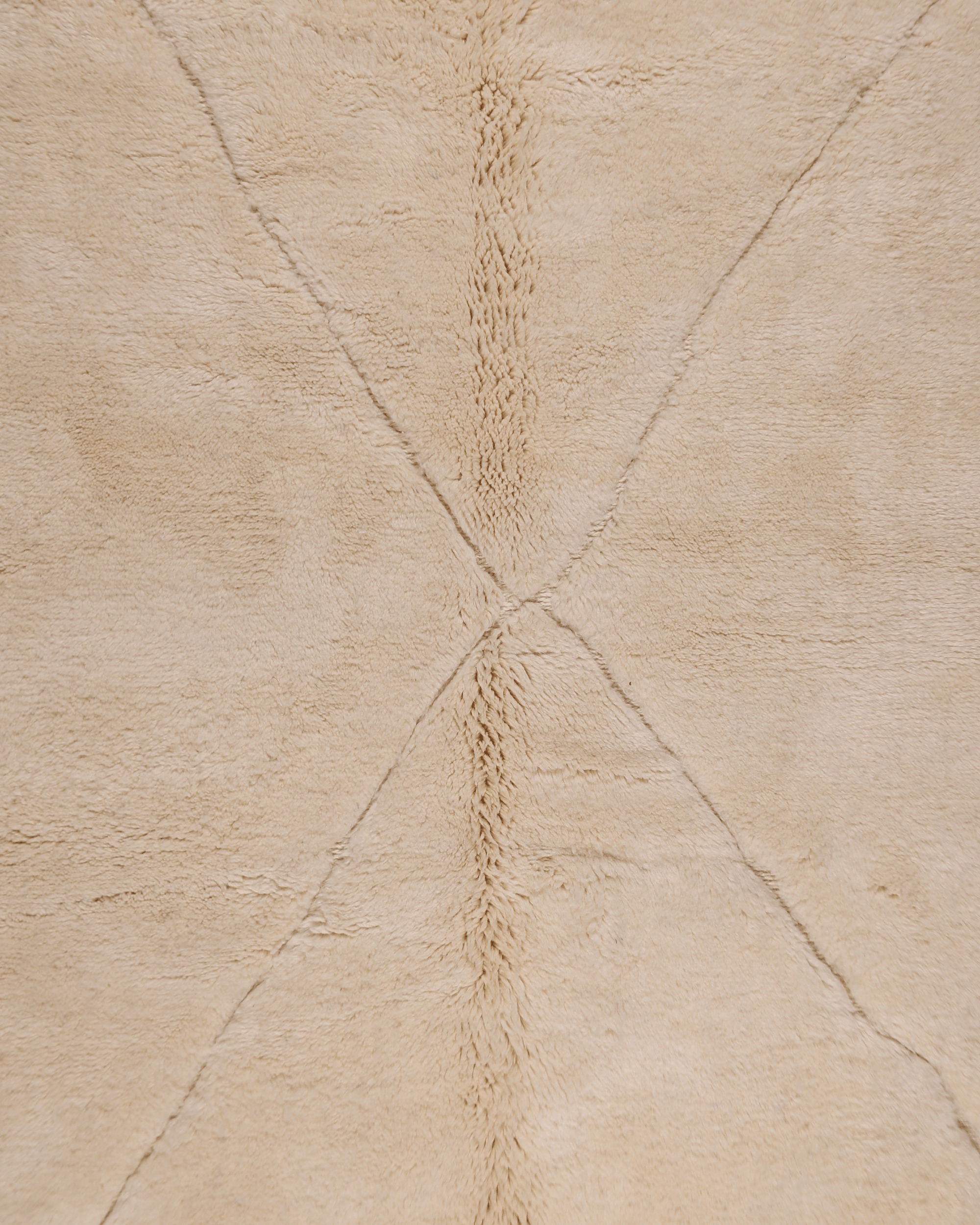 Crafted from 100% natural wool, this piece features a warm ivory base accented by understated diamond lines, creating a refined and balanced geometric composition. The thick, plush pile offers exceptional comfort while maintaining a calm, architectural presence.