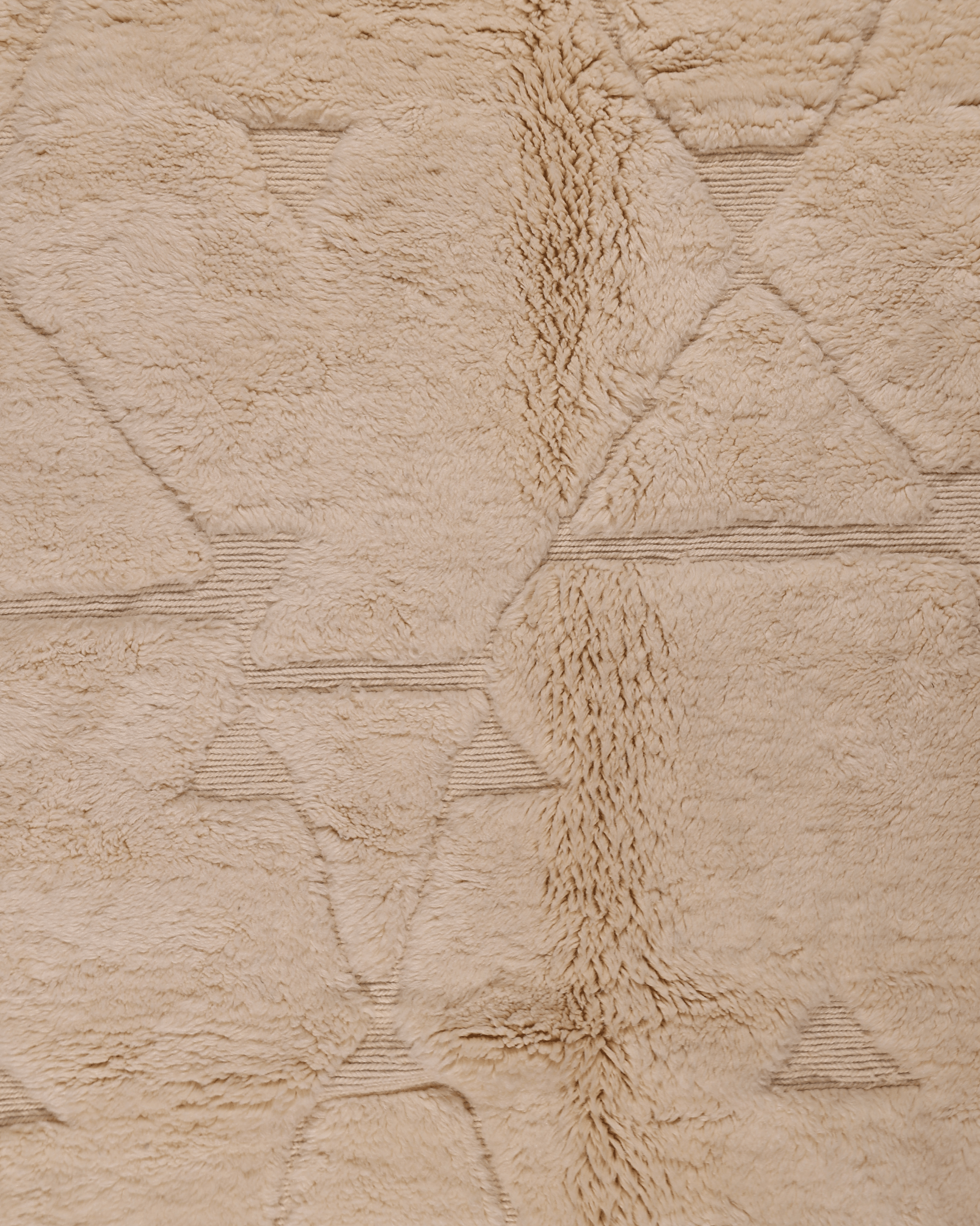 Woven from 100% natural wool, this rug features a soft ivory base with gently repeating geometric forms that create movement and visual harmony. The design is understated yet expressive, offering depth and texture while maintaining a refined, minimalist presence.
